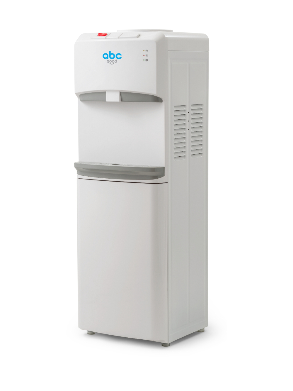 Підлоговий кулер з компресорним типом охолодження води та верхнім завантаженням пляшки. Охолоджує воду 3-4 літри на годину до температури 5-9 градусів. Також кулер ABC V100 має функцію нагрівання води 5-7л на годину до 90-95 градусів, що дозволить готувати гарячі напої, чай, каву дуже швидко та легко. Крани кулера ABC V1 00 виконані на кшталт "натиск кнопкою" на верхній частині апарата. Існують три кнопки на гір, хол, кімнатну воду. Кран гарячої води із захистом від дітей. Дана модель кулера підлога виконана в білому кольорі і чорною вставкою в зоні індикації, що допоможе вписатися в дизайн інтер'єру вашого офісу або будинку. А невеликі його габарити, хоч і підлоговий, сприятимуть зручності розташування кулера.
