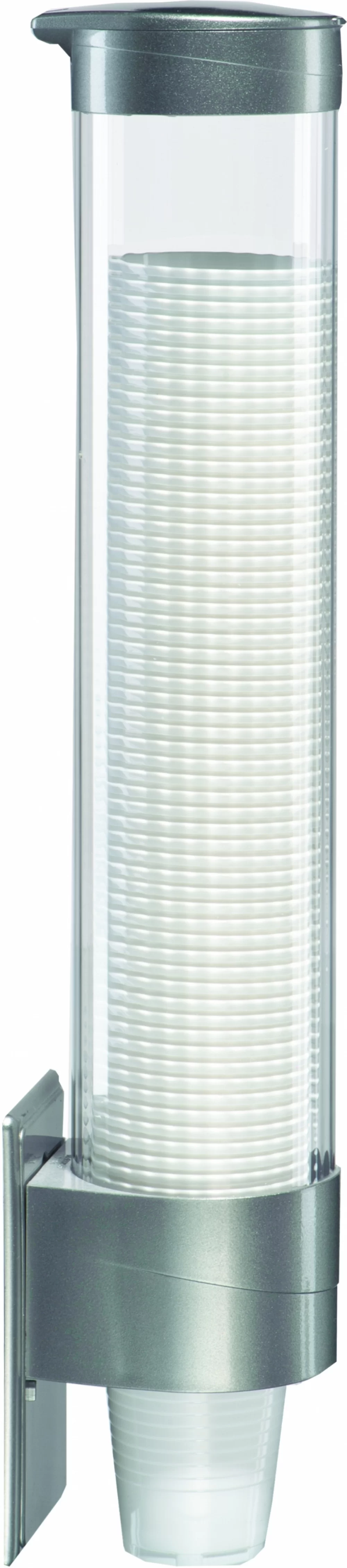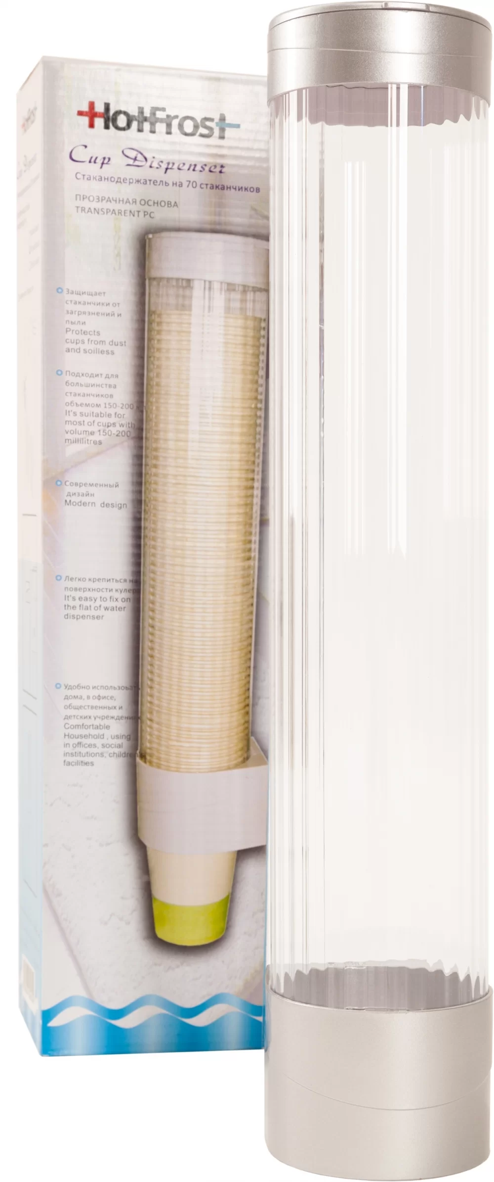 Ємність для стаканчиків виготовлена з прозорого пластика, а кришка і кріпильна частина з пластика срібного кольору.